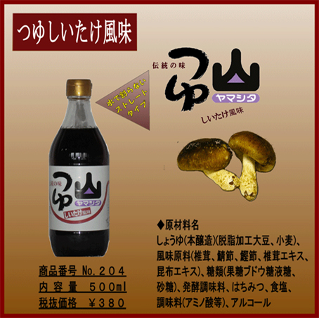 甘口のさしみ醤油です。普通の醤油に比べ塩分をひかえめにし、うまみと甘味に適度な粘度がさしみに適しています。さしみは勿論、しっかり醤油色を付けたい煮物(豚角煮・昆布等の佃煮)にも最適です。 |