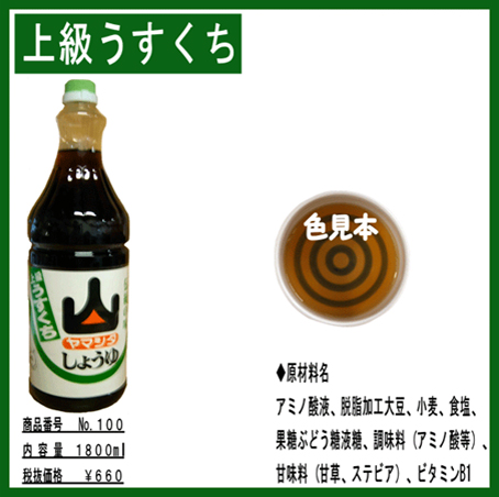 色が薄く、旨味、甘味の調和がとれた塩分控えめのうすくち醤油です。料理する材料の色、もち味を生かせる醤油です。お吸い物、うどんつゆ、お煮しめ等に最適です。 |