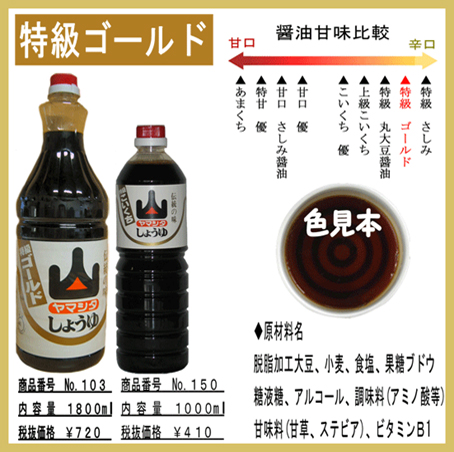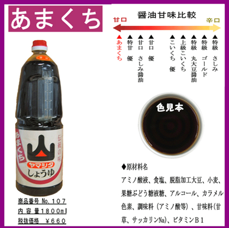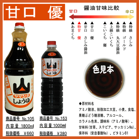 あまくちタイプの濃口醤油です。普通の醤油に比べ塩分をひかえめにし、うまみと甘味をふやした濃厚な醤油で、砂糖を使わなくても甘く仕上げられる点も特徴です。 |