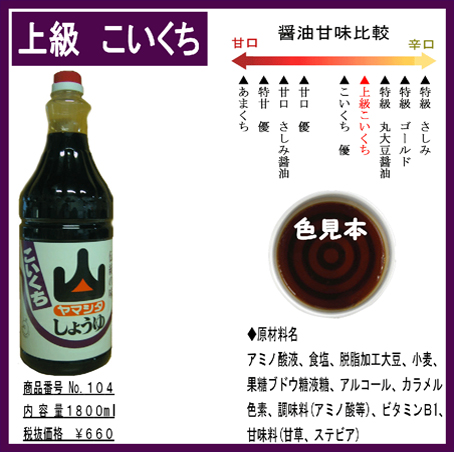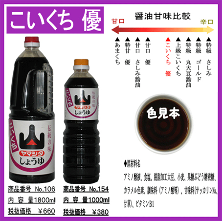 うまくちタイプの濃口醤油です。旨味と甘味のバランスが良く、濃厚な味わいのこいくち醤油です。かけ醤油・煮物にも最適です。 |